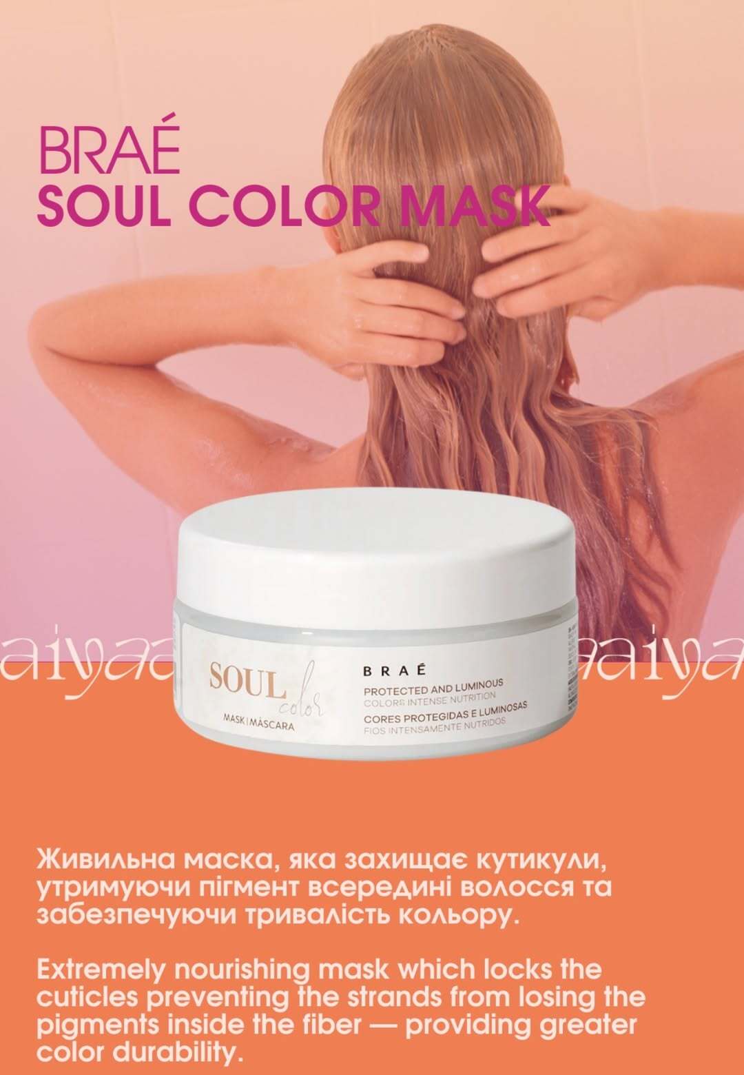 Aiya Beauty Care представляє Braé Soul Color — унікальну лінійку догляду за волоссям, створену для захисту, живлення та збереження яскравості вашого фарбованого волосся. Насичена антиоксидантами, UV-фільтрами та сумішшю натуральних олій, Soul Color допомагає утримувати вологу, запобігає вицвітанню та підсилює яскравість кольору з кожним миттям. Її ніжні, безсульфатні формули очищують і кондиціонують волосся, не висушуючи його, що робить її ідеальною для підтримки насичених, сяючих відтінків. З Braé Soul Color у вас є необхідний догляд, щоб ваше фарбоване волосся було м'яким, блискучим і сповненим життя.